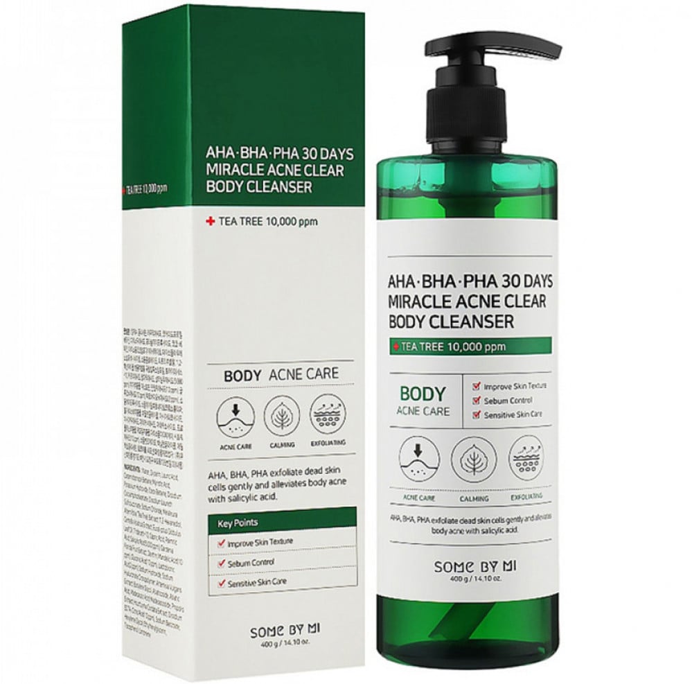 سوم باي مي ايه اتشت ايه بي اتش ايه 30 يوم غسول جسم احماض التقشير المعجزة 400 مل غسول للجسم يساعد بتنظيف البشرة من الأوساخ والخلايا الميتة التي تسبب ظهور الحبوب خاصة في مناطق الكتفين والظهر. يحتوي على تركيز غني من حمض السالسليك وأحماض التقشير الطبيعية التي تعالج حبوب البشرة بتنظيفها لخلايا البشرة الميتة، الأوساخ، والدهون الزائدة.