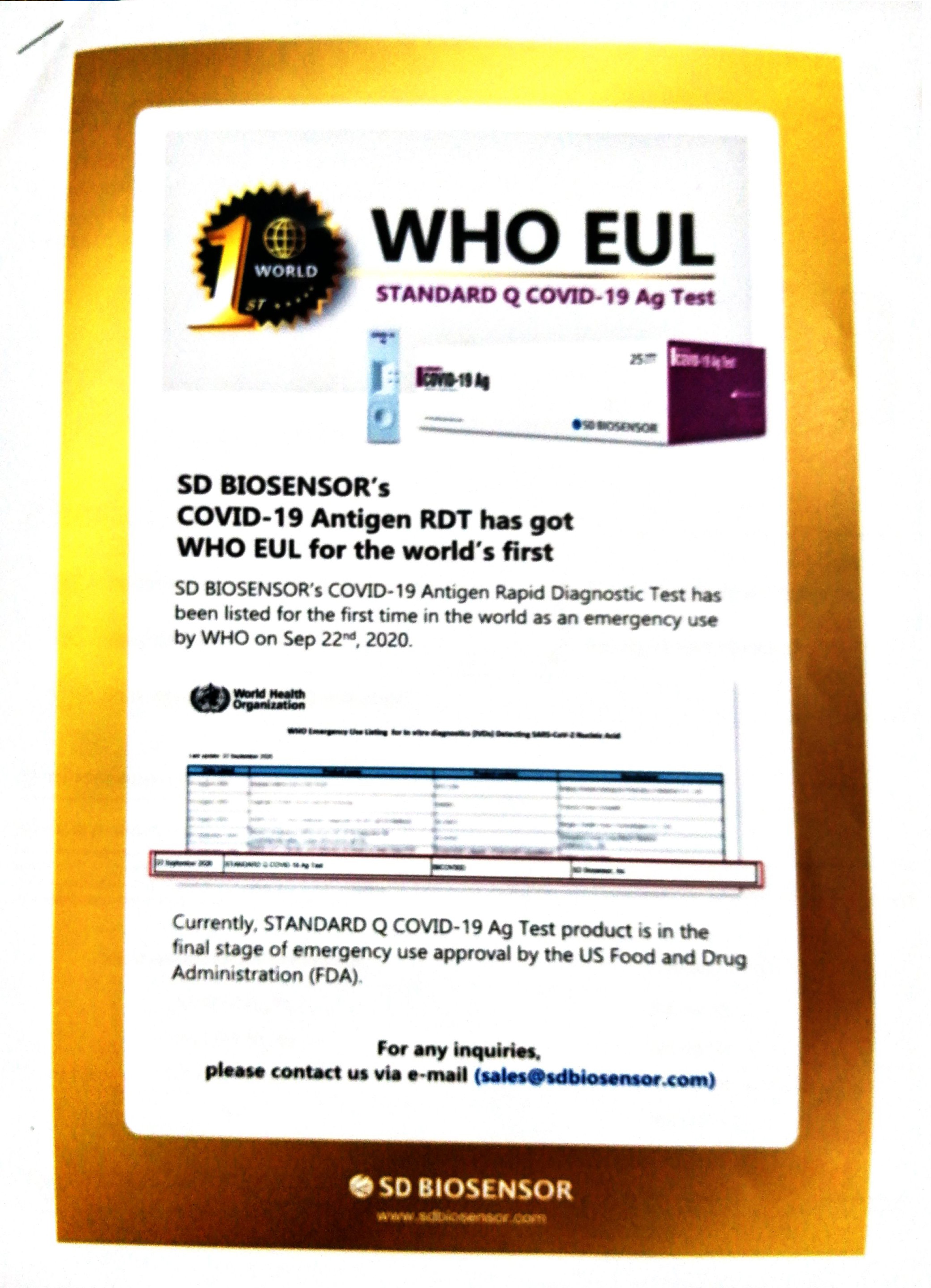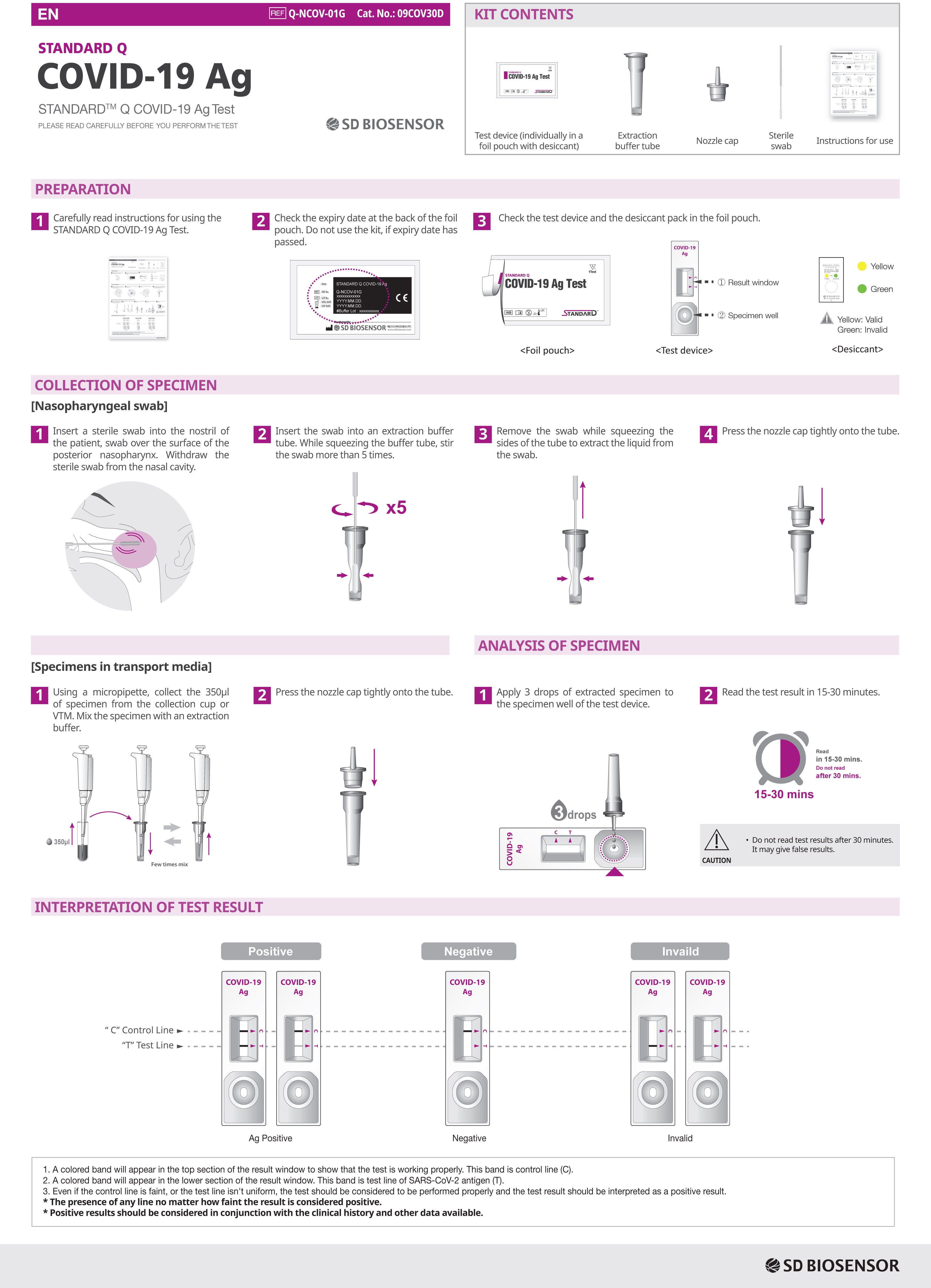 اختبار كوفيد 19 Covid 19 Test هو الكشف عن مستضد SARS-CoV-2 الموجود في عينة الانف الأنفي البشري في غضون 15 دقيقة. يحتوي STANDARD Q COVID-19 Ag على 1 جهاز اختبار و 1 أنبوب عازل و 1 غطاء فوهة و 1 مسحة أنفية بلعومية و IFU واحد. الطقم جاهز للاستخدام بدون معدات في بيئة نقطة الرعاية.
