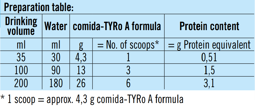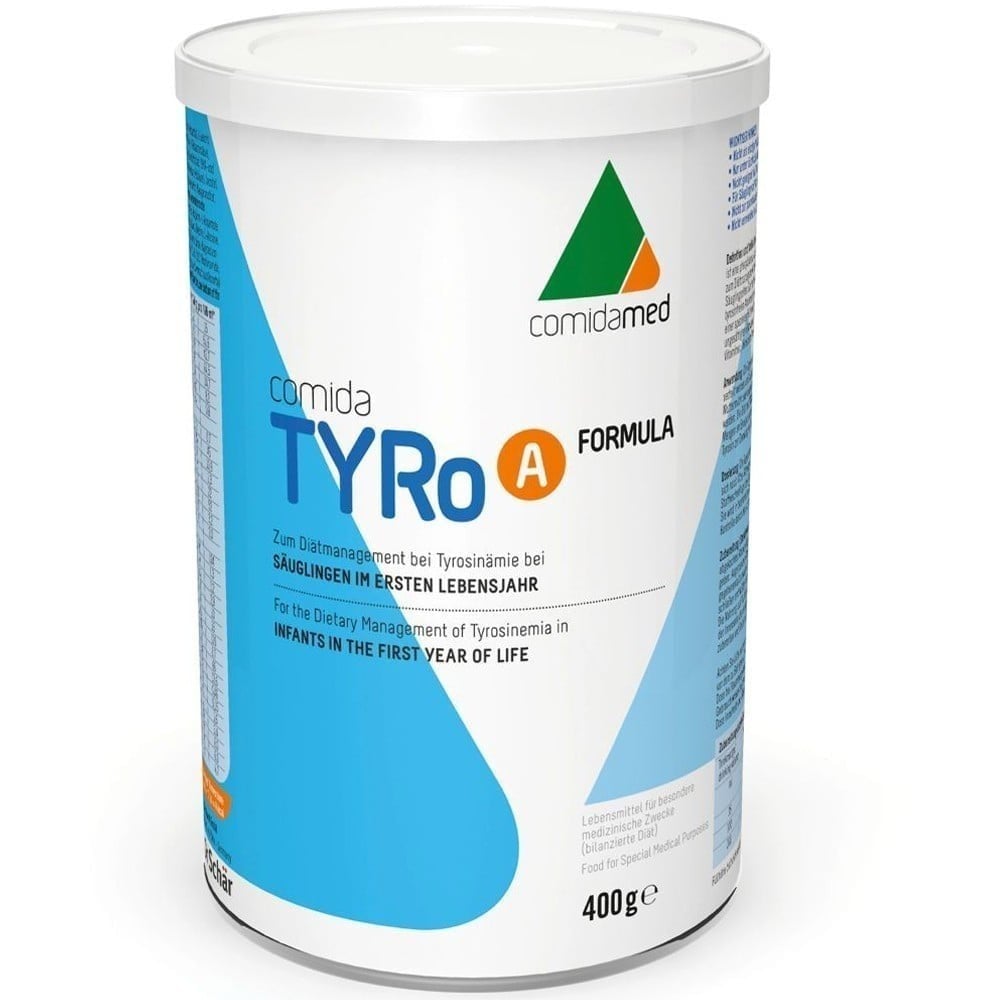 كوميدا TYRo-A فورمولا 400 جرام مكمل غذائي للرضع تحت عمر السنه المصابين بمرض تيروزين الدم بأنواعه الثلاثة، يتميز هذا المنتج بتركيبته الفريدة التي تتضمن مجموعة من الأحماض الأمينية الخالية من الفينيل ألانين والتيروزين، بالإضاقة إلى اللاكتوز وLCP، وغيره من العناصر النزرة مثل (الزنك، والكروم، حديد...) ومجموعة من الفيتامينات والمعادن الضرورية لنمو الطفل.