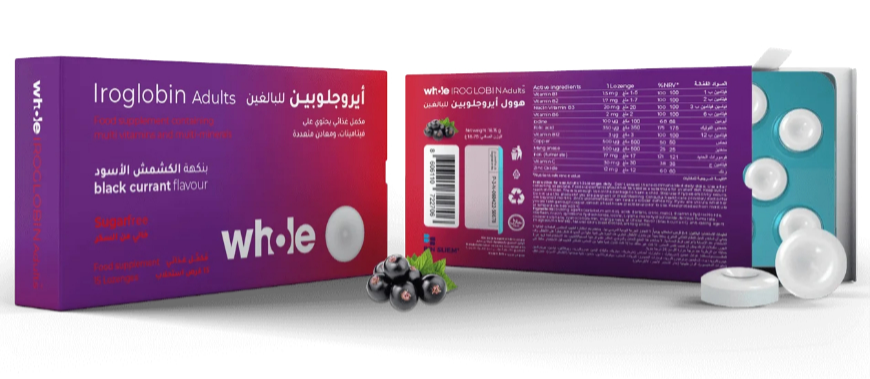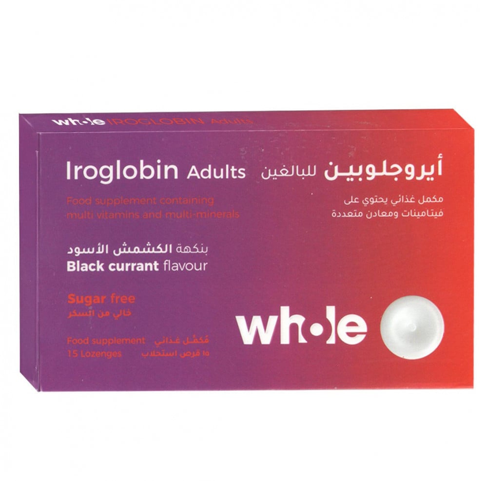 هوول ايروجلوبين Whole Iroglobin Adults مكمل غذائي للبالغين اقراص فيتامينات متعددة بنكهة الكشمش الاسود 15 قرص في كل عبوة، مناسب للاستخدام من عمر 15 سنة وما فوق، تركيبته شاملة لأهم العناصر المغذية الضرورية لجسم الأنسان فهو مكمل غذائي فيتامينات متعددة ومعادن، مما يجعله خيارًا مثاليًا لأمراض فقر الدم وغيرها.