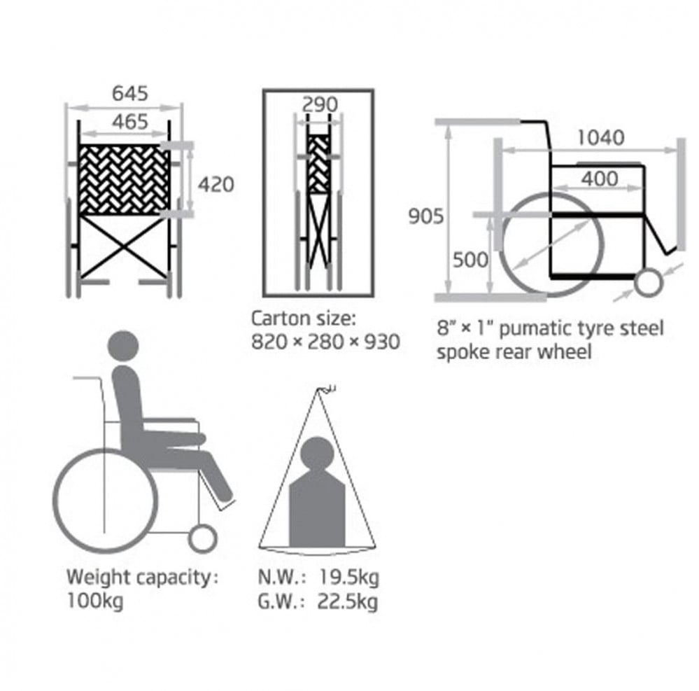 يتميز كرسي متحرك عادي يوويل 20 انش بالمواصفات التصميمة التالية: