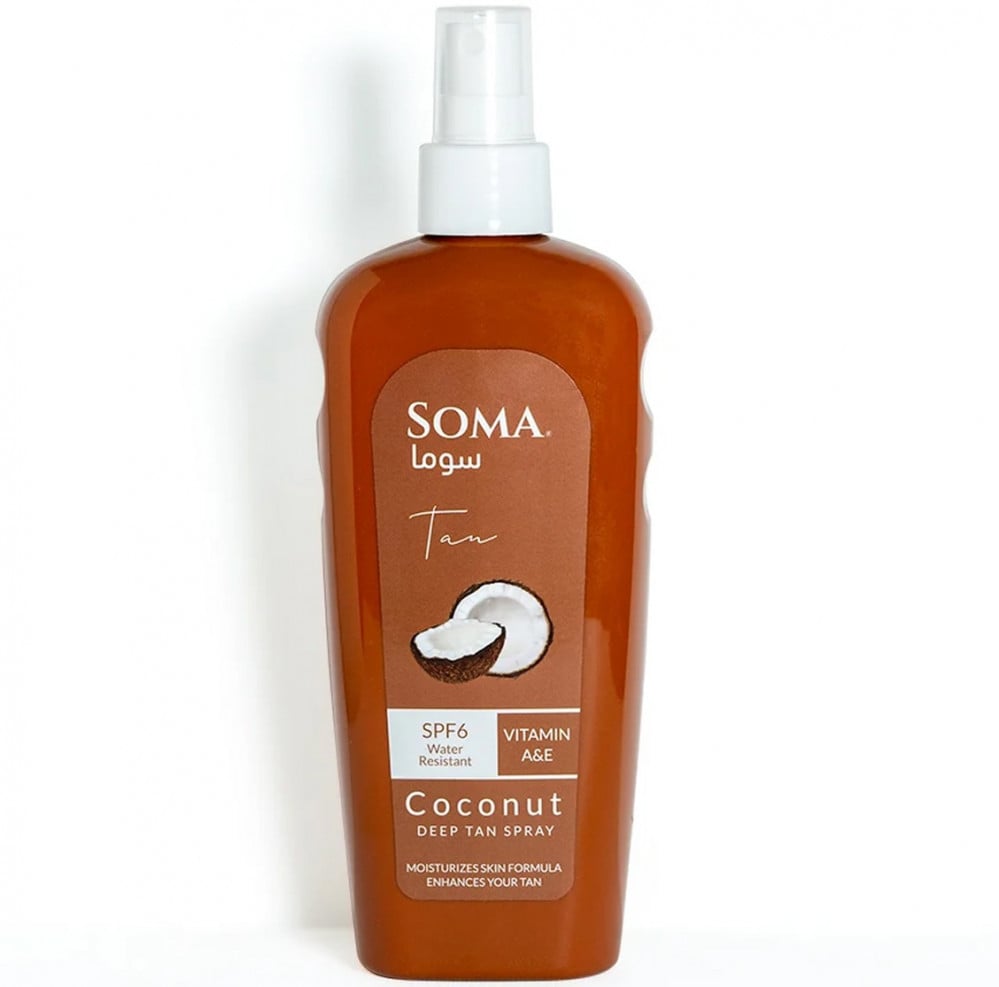 Soma tanning spray with natural coconut oil 250 ml. Soma tanning spray gives a golden tan color and contains natural accelerator oils, which are the colorant responsible for tanning the skin color and protects the skin from ultraviolet rays thanks to antioxidants - Soma spray is ideal for obtaining a long-lasting golden tan color.