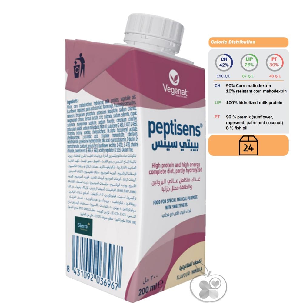 بيبتسينز فانيليا 200 مل - نظام غذائي كامل عالي البروتين والسعرات الحرارية يوفر نظامًا غذائيًا كاملاً يحتوي على نسبة قليلة من البروتين والسعرات الحرارية، وهو متحلل جزئيًا. تساعد تركيبته من الكربوهيدرات بطيئة الامتصاص على التحكم في نسبة السكر في الدم لدى المريض، وهي غنية بحمض EPA وDHA.