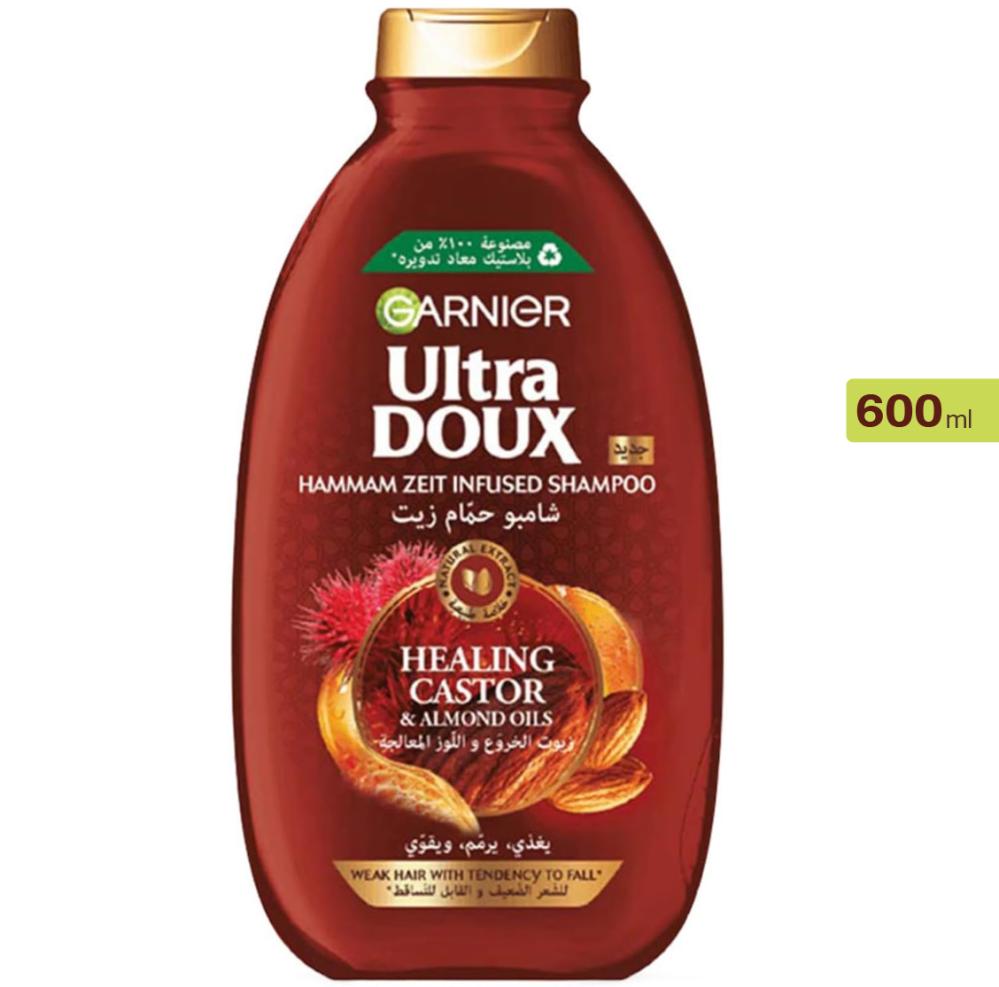 Garnier Ultra Doux Hamam Zeit Shampoo with Castor and Almond Oil 600ml GARNIER ULTRA DOUX HAMMAM ZEIT INEUSED SHAMPOO Garnier Ultra Doux Hamam Zeit Shampoo with Castor and Almond Oil Treated from Garnier: Inspired by the ritual of Hamam Zeit, discover the new effective recipe to strengthen weak hair that suffers from loss. We selected two precious ingredients, fortifying castor oil and nourishing almond oil, to create an exceptional therapeutic blend.
