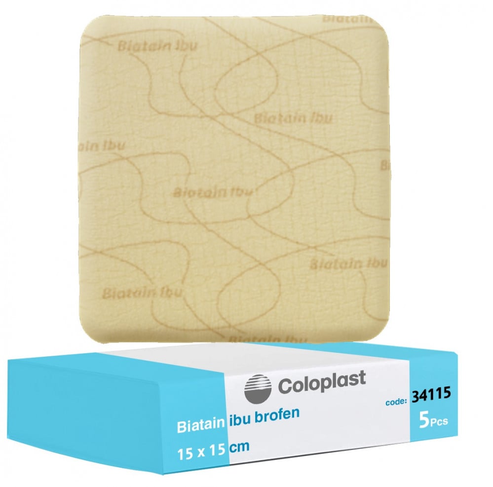 Coloplast Paste Bandage Soft and flexible absorbent foam bandage with ibuprofen Box of 5 pieces COLOPLAST BIATAIN IBU NON ADHESIVE 15×15 Soft and flexible absorbent foam bandage containing ibuprofen. Unique 3D Foam Structure for Superior Absorption Upon contact with secretions, Biatain®'s unique 3D foam structure conforms to the wound bed for superior absorption – even under pressure (2,6).